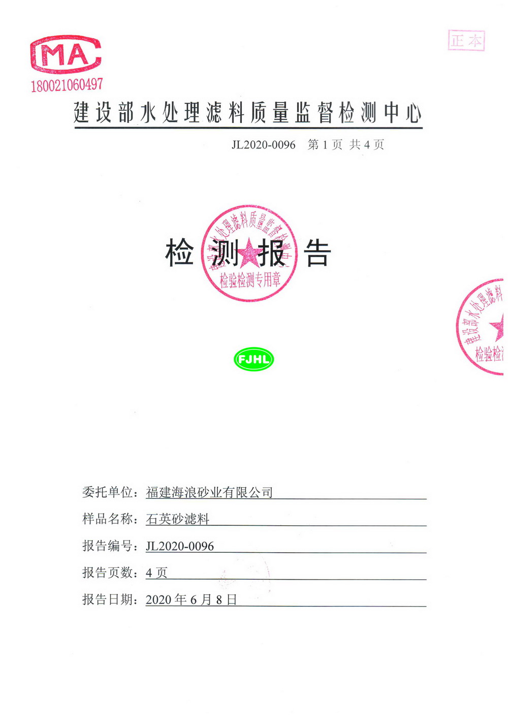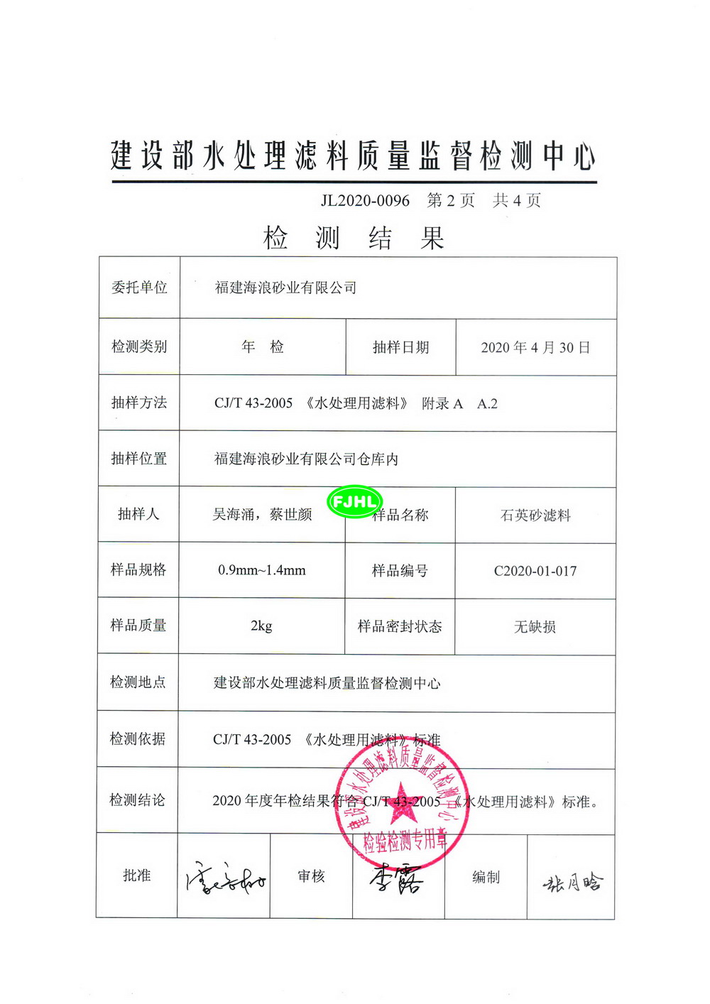 福建海浪砂業(yè)有限公司0.9-1.4石英砂濾料檢測(cè)報(bào)告
